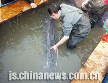 南京市一漁民于去年12月11日在長江下關水域從事正常捕撈作業(yè)時,無意中捕捉到這條長3.3米、重量在130公斤左右的國家一級保護動物——白鱘。當時這條呈灰白色的白鱘已多處受傷。