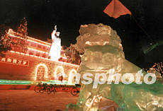 在東北寒冷地帶的吉林省會長春市中心,為歡慶新年準備好一座冰燈天安門,潔白的冰雕獅子與紅紅火火的城樓毛澤東塑像相映益彰。作者:賈國榮