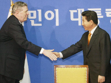 韓國當選總統盧武鉉13日在漢城接見了美國總統布什的特使、助理國務卿凱利,雙方就朝鮮核問題交換了意見。盧武鉉在會談中強調,韓美兩國應通過對話而不是武力來解決朝鮮核問題。凱利在結束對韓國的訪問后,還將前往中國、新加坡、印度尼西亞和日本訪問。