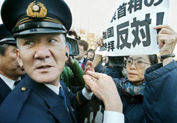 一位日本婦女在靖國神社門前手持抗議標語,反對首相小泉純一郎參拜。