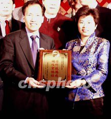 紐約華人社團聯合總會主席梁冠軍代表紐約僑界向代表團贈送了“鋪經貿橋梁、謀科技騰飛”的牌匾。