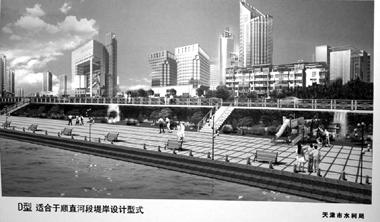 為了達到良好的觀水效果,規劃海河兩岸原則上不設獨立防洪墻,根據不同地段的地形、地貌及開發建設要求,在不影響外觀及功能的前提下,采用建筑物底層外墻結合防洪要求,或在不影響交通的前提下,局部抬高路面或設置觀水平臺,并通過現代化防洪調度、分流等措施,確保城市防洪、排瀝安全。