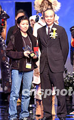 香港青年時裝設計家創作表演賽2003,1月17日在香港時裝節上舉行,自由設計師馬詩淇〔左〕作品榮獲全場總冠軍。洪少葵 攝