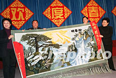 國務院僑辦主任陳玉杰(右一)與副主任李海峰(左一),二十七日在僑辦新春聯歡會上,代表國務院僑辦機關接受機關定點扶貧地區甘肅積石山縣代表贈送的新年壁毯禮品。作者:鄒憲