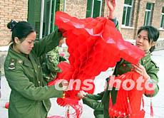 三十日,駐閩某部文藝連營房處處張燈結彩,一派春意盎然的景象,喜迎羊年新春。圖為今年首次在軍營歡度春節的女兵將大紅燈籠高高掛起。作者:劉可耕
