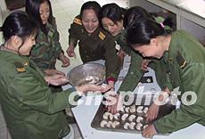 三十日,駐閩某部文藝連營房處處張燈結彩,喜迎羊年新春一派春意盎然的景象。慰問演出的女兵在連隊包起了年夜餃子。作者:劉可耕