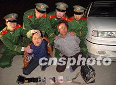 案發(fā)后,福建長(zhǎng)樂(lè)松下邊防派出所接到長(zhǎng)樂(lè)市公安局案情通報(bào),迅速組織干警在長(zhǎng)樂(lè)福清交界處的松下鎮(zhèn)路段進(jìn)行設(shè)卡攔截。下午五時(shí)十分左右,劫匪駕車逃逸時(shí)發(fā)現(xiàn)有干警在設(shè)卡檢查,遂掉轉(zhuǎn)車頭沿原路瘋狂逃竄,干警隨即緊追不舍,其中二名劫匪被當(dāng)場(chǎng)擒獲,現(xiàn)場(chǎng)繳獲自制手槍一支(內(nèi)裝二發(fā)彈)、匕首二把、轎車和手機(jī)及贓款二萬(wàn)零一百三十元人民幣等各類作案工具和贓物。