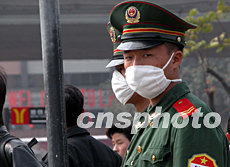 在廣州火車站執勤的武警戰士戴上口罩避免感染疾病。作者:柯小軍