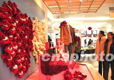 情人節將近,北京中友商廈將上百只毛絨小熊組成紅白兩顆愛心吸引顧客。作者:廖文靜