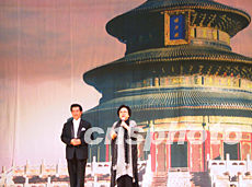 來自中國的老歌唱家十二日晚為一千名華盛頓華人華僑奉獻經典老歌,受到熱烈歡迎。這是中國著名歌唱家王昆(右)在向觀眾介紹男高音歌唱家郭訟。作者:余東暉