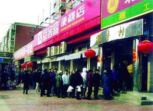 中午1點10分,記者在勁松橋西北角的稻香村分店門口看到,排隊的顧客有180多人,隊伍一直向西遮擋了該店隔壁兩家店鋪的街面,蜿蜒到了一棟宿舍樓前。排在最后的顧客已經開始聊天解悶。商店門口的柱子上則貼著“每人限購4斤”的告示,兩名男營業員站在柜臺外維持秩序,正在買元宵的顧客說,自己9點多就排上了,都快沒信心了才輪到。