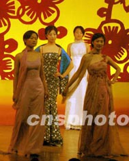 解放軍駐北京某部女戰士在元宵文藝晚會上進行時裝表演。時裝表演在解放軍女兵中很流行,這些軍中少女在節假日里時常利用報紙、床單等物品,制成時裝在軍營中展示美麗。作者:宋吉河