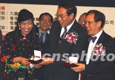 由香港九家媒體聯合主辦的“2002年特區政府施政十件大事”評選頒獎禮,二月十九日在中央圖書館舉行。圖為香港中聯辦副主任王鳳超(中)、特區政務司司長曾蔭權(右)向榮獲一等獎的投票讀者馮明嬌女士頒獎。中新社傳真 潘索菲 攝