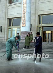 工作人員二十三日在北京人民大會堂門外清理地面灰塵,迎接將于三月初召開的第十屆全國人民代表大會與全國政協十屆會議。作者:毛建軍