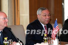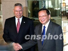 中國外交部長唐家璇二十四日上午在北京與美國國務(wù)卿鮑威爾舉行會(huì)談,參加會(huì)談的美方人員有美國駐華大使雷德等,雙方就中美關(guān)系及共同關(guān)心的國際和地區(qū)問題廣泛深入交換了意見。作者:鄭萍萍