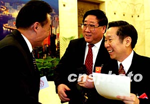 國務(wù)院港澳辦副主任陳佐洱(右一)七日參加香港人大代表團分組討論,與吳邦國、高祀仁(右二)交談。作者:鄭萍萍