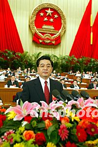胡錦濤今天身著深色西裝,面含微笑。這是他第一次作為國家主席站在人代會的講壇上。胡錦濤的講話,贏得全場多次如潮掌聲。