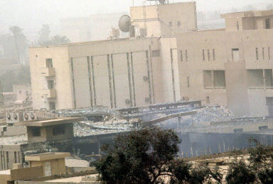 3月26日,美英聯(lián)軍再次轟炸巴格達(dá),伊拉克國(guó)家電視臺(tái)在空襲中被炸。