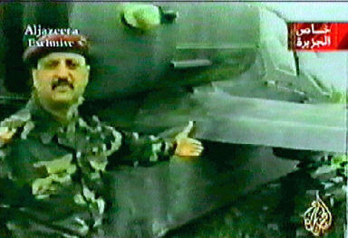 27日,美阿帕奇直升機在中幼發拉底地區被伊拉克防空炮火擊落。圖為卡塔爾半島電視臺播放的畫面,一名伊軍官在墜落的直升機前做講解。