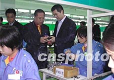 泰國華人青年商會潮汕地區經濟文化訪問團三月二十八日在廣東汕頭參觀奧迪玩具實業有限公司。該公司總經理蔡東青(后左三)向訪問團團長李桂雄(后左二)介紹情況。作者:王惠存