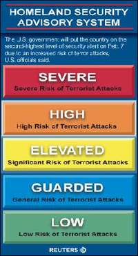 據路透社報道,自伊拉克戰爭開打以來,美國的國家恐怖警戒級別就一直處于第二強度的次最高級級別,即“橙色”“危急”級別。