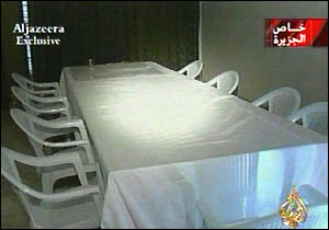 其中一個房間是一個裝飾有伊拉克鷹的簡陋的錄像室。他可能在這里錄下了他的“不投降”的電視講話。后面的背景窗簾正好和發(fā)表講話那天的背景一致。在一臨時會議室里有塑料椅子和鋪著床單的桌子,在另一房間里則還有放著皺巴巴的毯子的一些床鋪。(春風)