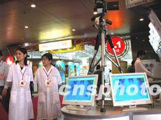 為預(yù)防“非典型肺炎”,二十五日開館的廣交會二期在展館內(nèi)外設(shè)置眾多“紅外測溫儀”預(yù)防“非典”。作者:柯小軍