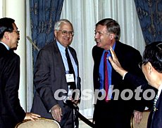 應美國百人會第十二屆年會邀請,兩位美國前駐華大使芮孝儉(左二)和羅德(右二)二十五日在紐約百人會年會專題討論會上發表演講,兩人均稱目前美中關系發展良好,臺灣問題仍是美中關系的核心問題。作者:趙海燕