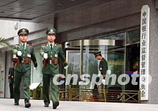 中國銀行業監督管理委員會二十八日正式掛牌。銀監會將行使原由中國人民銀行履行的監督管理職權。圖為武警戰士在銀監會門前執勤。作者:毛建軍
