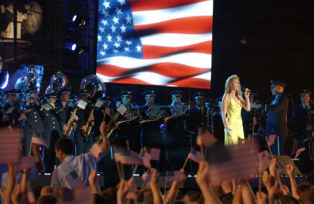 美國(guó)空軍預(yù)備軍官樂(lè)隊(duì)在哥倫比亞公司在2日錄制的特別節(jié)目“搖滾美國(guó)——向美軍致敬”中,登上杜魯門號(hào)航空母艦與獲葛萊美獎(jiǎng)的女歌手席琳狄翁一起表演“天佑美國(guó)”。(路透)