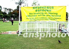 香港市民在“非典型肺炎”疫情放緩之際,暫且放下口罩走出戶外在公園草坪享受清新空氣.而宣傳檢控亂拋垃圾的廣告備受注目。洪少葵 攝