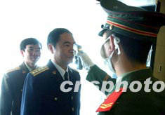 北京武警士兵五月在小湯山解放軍野戰醫院嚴查官兵的體溫,保證軍方的一批博士和碩士醫學專家在抗擊“非典”的戰役中安然無恙。中新社記者:賈國榮