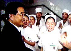 上午10時,胡錦濤總書記來到四川省人民醫院看望醫務人員和病員,并在這里親自主持了醫務界及有關方面代表參加的防治非典座談會。