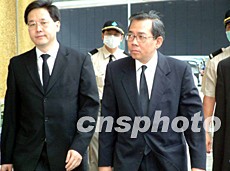 公務(wù)員事務(wù)局局長王永平及政制事務(wù)局局長林瑞麟,5月22日到香港殯儀館悼念為救治非典型肺炎而殉職的屯門醫(yī)院女醫(yī)生謝婉雯。洪少葵 攝