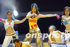 歌星陳慧琳5月24日出席香港大球場茁壯行動“1:99音樂會”慈善演唱,與舞蹈員載歌載舞。中新社傳真 鄧慶樂 攝