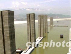 今日下午四時三十分,最后一艘導航浮船箱,被中國武警水電雄師精確定位于兩個浮堤支墩之間,八艘浮船箱在永久船閘前形成了一條南北各長二百五十米的“浮動安全墻”,為明日開始的船閘實船測試和十六日的試通航提供了安全保障。
