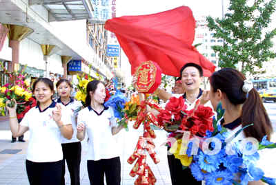 王府井的一家專賣店里別出心裁地放起了薩克斯版的《回家》,這里的老板說,他們希望市道重振,能盡快向SARS之前的水平回歸。這家店的對面——中國照相館門前,五星紅旗與黨旗齊舞,數十只彩色氣球被派發或放飛天際,為北京祈福。