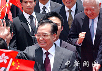 中國國務(wù)院總理溫家寶,六月二十九日中午乘專機(jī)抵達(dá)香港國際機(jī)場,在香港進(jìn)行為期三天的訪問。圖為在香港國際機(jī)場溫家寶受到人們的熱烈歡迎。中新社記者 錢興強(qiáng) 攝