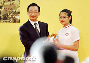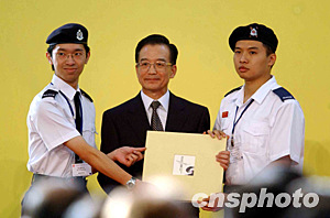 國務(wù)院總理溫家寶6月30日香港表揚(yáng)醫(yī)護(hù)人員成功克服SARS聚會(huì)上,接受香港學(xué)生贈(zèng)送紀(jì)念品。洪少葵 攝