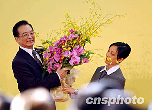 國務(wù)院總理溫家寶6月30日在香港出席表揚(yáng)醫(yī)護(hù)人員成功抗炎大會(huì)時(shí),接受醫(yī)護(hù)人員獻(xiàn)花,總理溫家寶隨即將花轉(zhuǎn)送在抗擊SARS中殉職的醫(yī)護(hù)人員家屬時(shí),受到在場(chǎng)人士的陣陣掌聲。洪少葵 攝