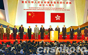 溫家寶說∶今天是香港回歸祖國六周年的喜慶日子。在香港萬眾一心戰勝SARS、奮力重振經濟的重要時刻,我代表中央政府和全國各族人民,向香港特別行政區政府、香港同胞和各界人士表示熱烈祝賀和良好祝愿。