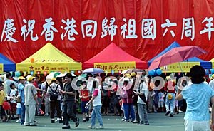 香港慶祝回歸六周年在維園舉辦大型慶祝活動,吸引眾多市民頭頂烈日參與嘉年華場內游戲活動。洪少葵 攝