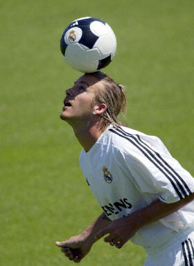 7月2日,剛剛從英超曼聯轉會到西甲皇家馬德里的英國球星大衛·貝克漢姆在馬德里身著新隊服展示球技。