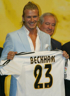 中新網7月3日電 1997年,曼聯(lián)的法國球星坎通納(Eric Cantona)退休后,貝克漢姆就取而代之,成為7號球衣的主人。在國家隊里,他的球衣號碼也是7號。可是皇馬的7號球衣已歸主將勞爾,依照慣例,貝克漢姆必須另選號碼。