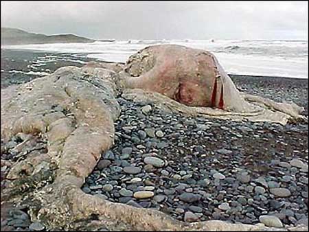 上周被海水沖上智利蒙特港附近海灘的一大塊黏滑肉質物體可能是一種稀有的巨型章魚,或者只是死去鯨魚的一塊鯨脂。智利鯨魚保護中心表示,這具遺骸長12.4米,重約13噸,6月24日在馬烏林附近的太平洋海岸被人發現,原先人們誤認為是鯨魚。