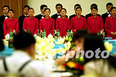 四日晚,整裝待命的侍應生在人民大會堂金色大廳內迎候來京旅游的香港和韓國、澳大利亞的549名游客。北京旅游局從即日起將陸續在大會堂宴請北京“雙解除”后的境內外游客。中新社記者 鄭萍萍 攝
