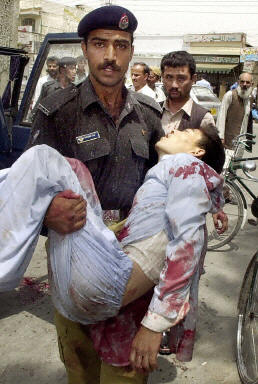 巴基斯坦西南部城市基達的一個什葉派穆斯林的清真寺內4日發生自殺爆炸事件,至少15人死亡,數十人受傷。圖為巴基斯坦警察正在運送受傷人員。