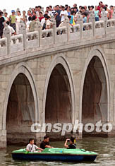 七月十三日,北京頤和園著名景點十七孔橋上人頭攢動。當天,實行優惠票價的頤和園迎來“非典”疫情后的最高客流量。中新社記者:張煒