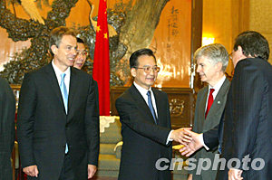 中新社北京七月二十一日電(記者張朔)中國總理溫家寶今天在人民大會堂與來訪的英國首相布萊爾舉行會談,雙方對“一國兩制”方針在香港的實施均給予積極評價。
