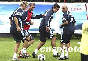 皇馬巨星在昆明進行技戰術演練。自左到右為:貝克漢姆,齊達內,菲戈,卡洛斯 中新社記者:毛建軍